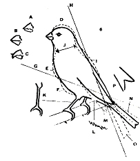 Посадка - приведена на рисунке, центральная ось, проходящая через тело канарейки, должна составлять с горизонталью не более 45-50 градусов.