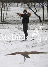 Первый раз птица зовется на шнуре с обычной присады. Мгновенный прилет - гарантия от неприятностей. Затем шнур снимается, и 3-4 раза птица зовется с обычной дистанции за малое вознаграждение, а за последний прилет кормится вползоба. Несколько дней свободных полетов с увеличением кратности и дистанции позволяют Вам двигаться дальше.