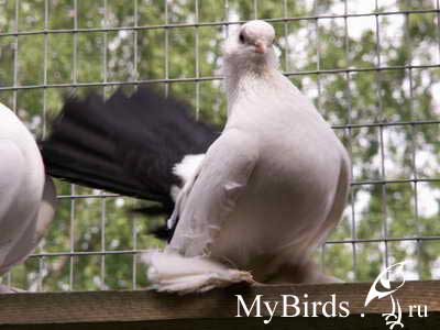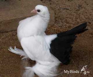 Еще один факт, на который хотелось бы обратить внимание – это удаление белого подхвостника. Спаривание с белыми особями чернохвостых подхвостники не уменьшает, но и не увеличивает. У пестрых голубей, как правило, хвосты без подхвостников и очень часто их рекомендуют как средство улучшения окраса хвоста. Но это неверный шаг, так как он никогда не приведет к чистокровности породы по рисунку. Имеется опыт спаривания чернохвостого голубя без подхвостника с белой голубкой. Окрас голубя полностью передавался молодым и последующим поколениям, а дальнейшая паровка таких особей с чернохвостыми, имеющими подхвостник, позволяла постепенно его устранить. Паровка же с белой голубкой была вынуждена наличием у голубей черной точки у глаза, и очень хорошими остальными характеристиками голубки. В результате потомство имело хвосты без подхвостника и не имело черных помарок.
