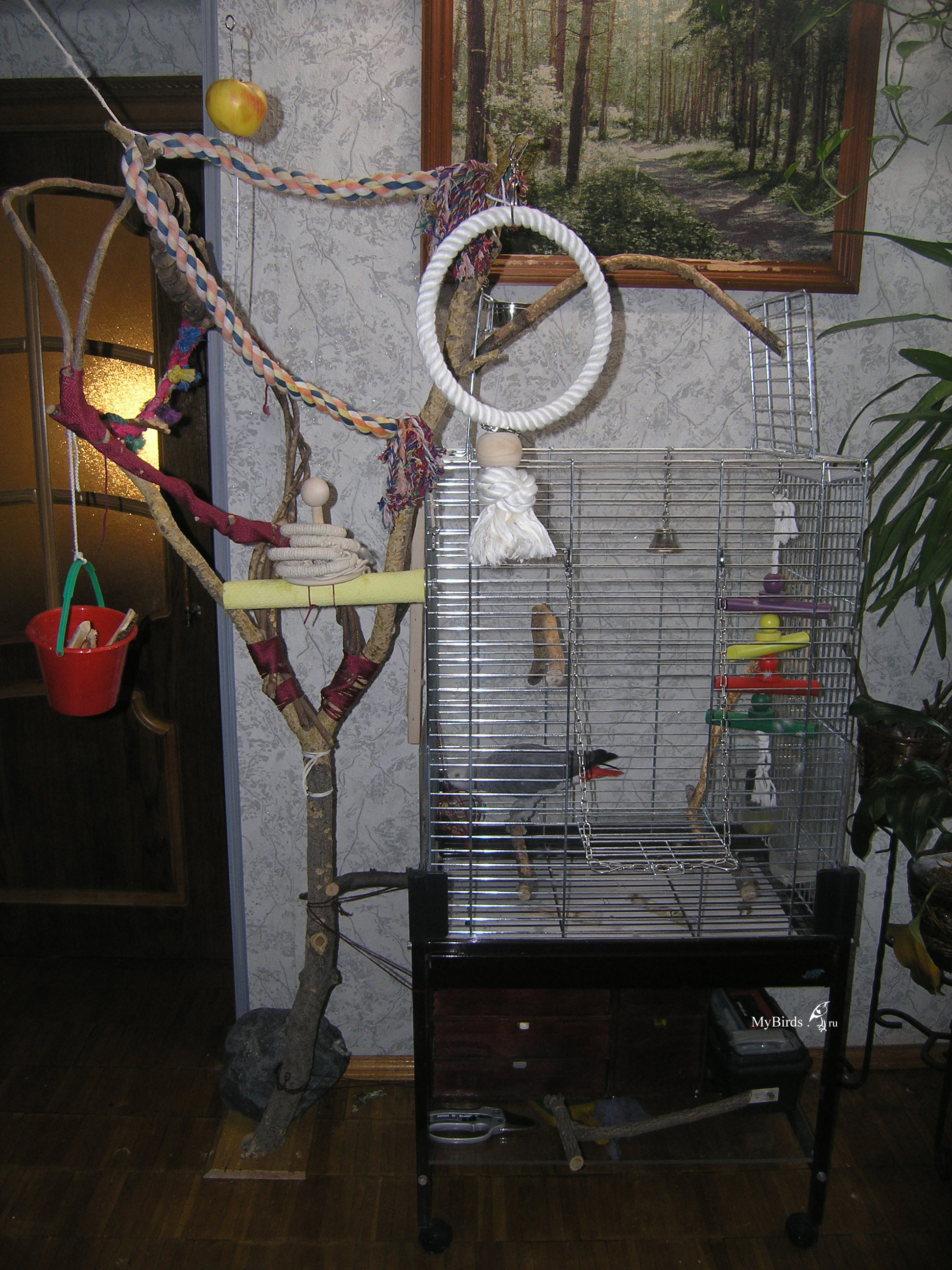 пример правильного расположения клетки и игрового стенда    Итак, Вы хотите купить крупного или среднего попугая и уже определились с конкретным видом.  Пора покупать клетку для будущего питомца, подыскивать ей оптимальное место в квартире и обустраивать место жительства будущего члена семьи.