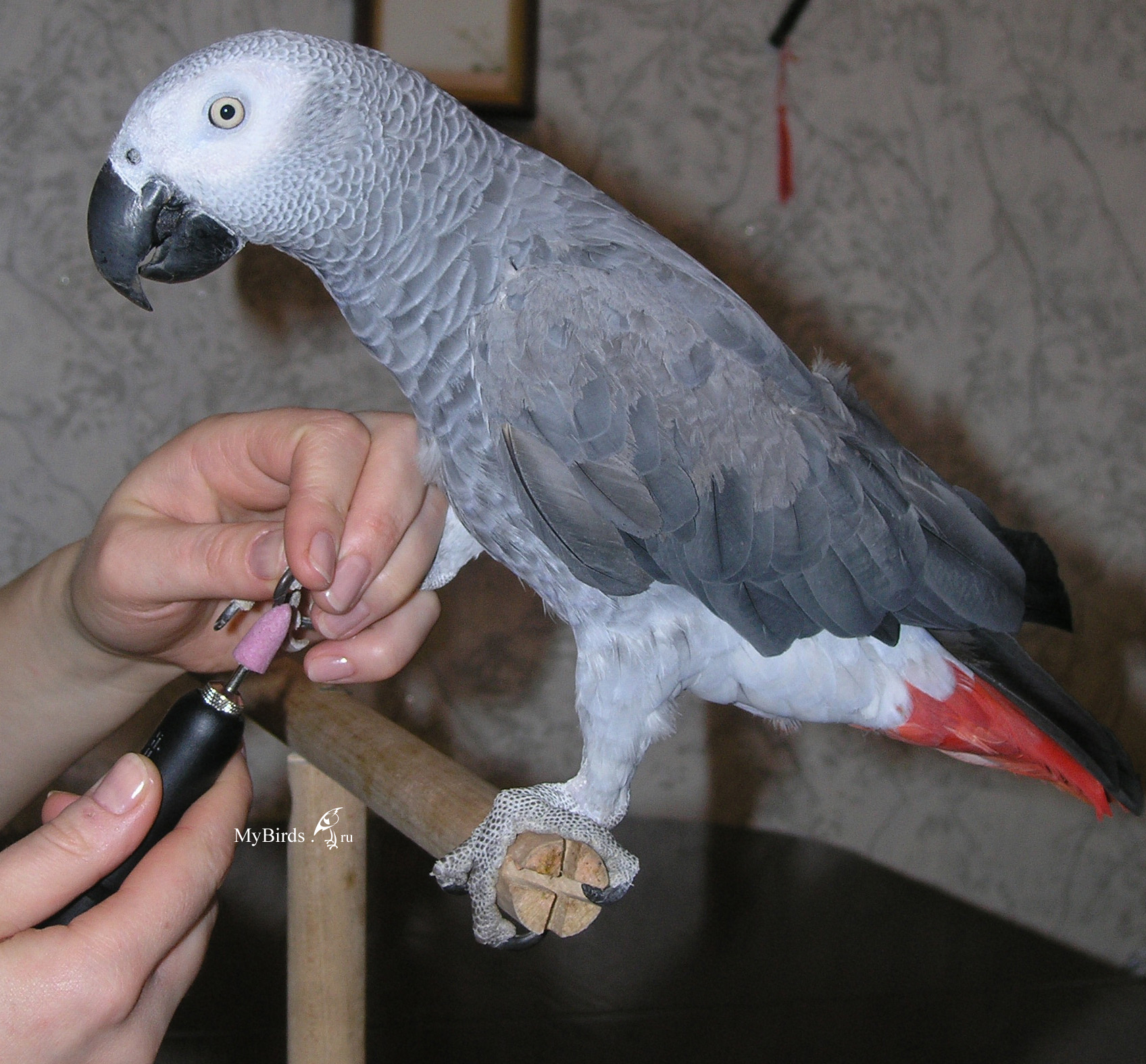 подпиливание когтей     Помимо ежедневной уборки, необходимо регулярно мыть клетку. Если ее размеры позволяют, лучше это делать непосредственно в ванне, но, ставя клетку в ванну, надо помнить, что решетка имеет острые края и может повредить эмаль. Если такой возможности нет, клетку придется мыть в комнате. Что бы удалить налипший помет, надо несколько раз с небольшим интервалом обрызгать клетку горячей водой из пульверизатора, удалить загрязнения тряпочкой или щеткой, потом протереть чистой влажной тряпкой. Выдвигающиеся поддон  и решетку, а также жердочки, игрушки и кормушки  нужно  вымыть в ванной с мылом, как следует ополоснуть водой и ошпарить кипятком. Не  следует при уборке применять хлор- и кислотосодержащие вещества, так как всегда есть риск отравить птицу, как бы тщательно Вы ни смывали химикаты водой.