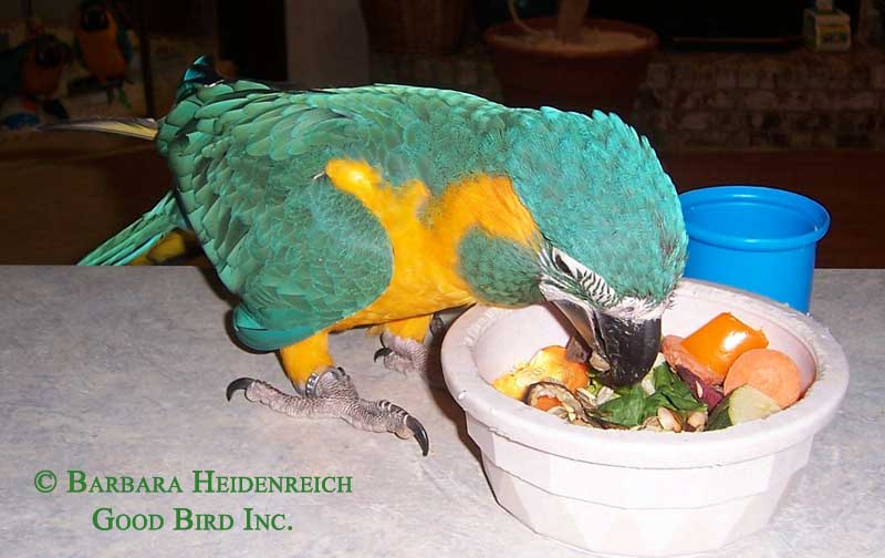 Давайте птице гранулированный корм, а во время обучения (дрессировки) - прочую пищу: если Ваша птица не отказывается от гранулированного корма, Вы можете давать ей гранулы до того момента, когда решите начать обучение. Во время занятия можно предложить другие виды пищи, обычно присутствующие в рационе птиц, такие как фрукты и овощи, тёплая пища (каши, мягкие смеси – прим. Helen T), семена и орехи. Таким образом Ваша птица получит все необходимое ей питание, но не одномоментно. Однако, прежде чем принять указанную стратегию, необходимо убедиться в том, что Ваша птица ест гранулированный корм.