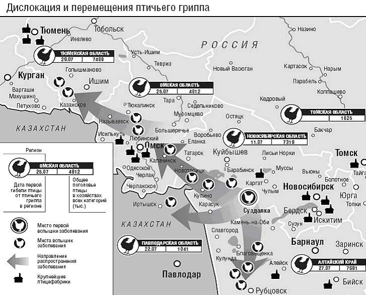 - легкостью вовлечения в эпизоотию птичьего гриппа новых птицеферм за счет слабой ветеринарно-санитарной защиты птицефабрик;