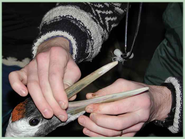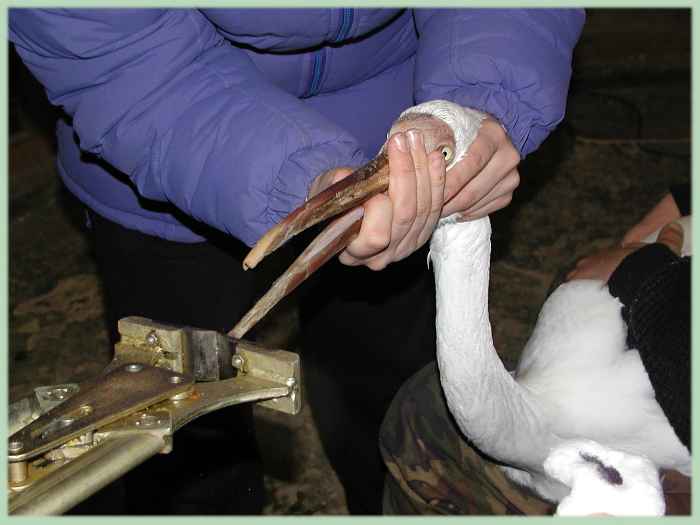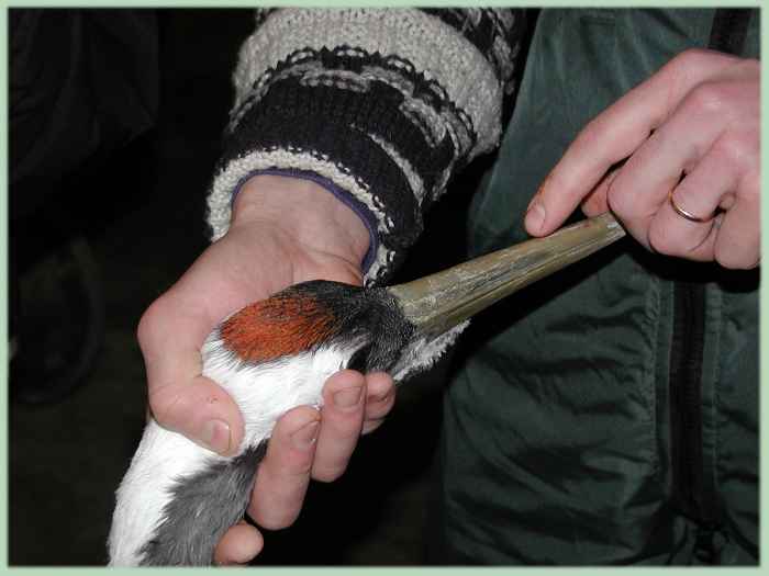 2. Подрезка отросших клювов и когтей. Если травма клюва не коснулась зоны его роста, то подрезка отрастающих частей вершинной части клюва не представляет большой трудности для персонала и не травмирует птицу. Если в результате травмы повреждается зона роста клюва, то его длина не восстанавливается. В природе такая птица обречена на гибель от голода. В неволе птицы приспосабливаются брать корм из кормушек. Для облегчения кормления журавлей с травмированными клювами разницу в длине между обломанной частью клюва и второй его половиной следует