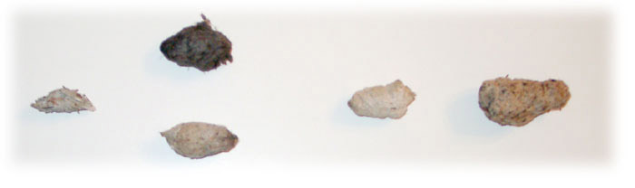 5 нормальных погадок. Слева направо: маленькая погадка из перепёлки (это можно понять по перьям крыла), погадка после 2 кроликов (один кролик белый и один тёмный), погадка после мыши (три мыши), погадка после крысы (одна целая крыса)