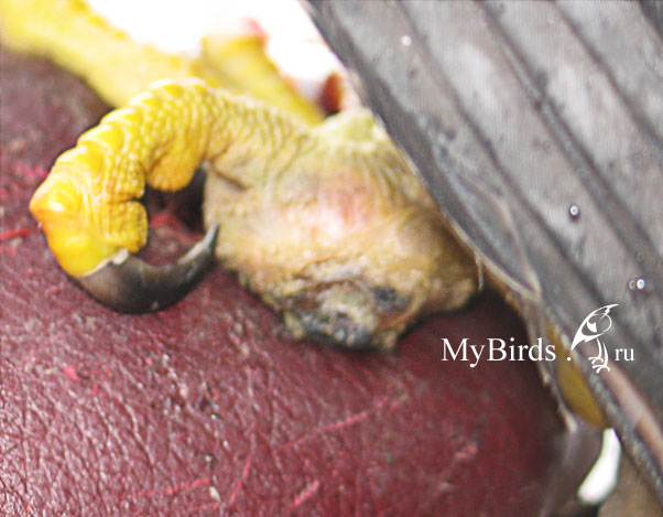 Стадия 4. Серьезно затронуты ткани. Прогноз неблагоприятный. Возможно, следует провести ампутацию для сохранения жизни птицы. Рис.13, 14.