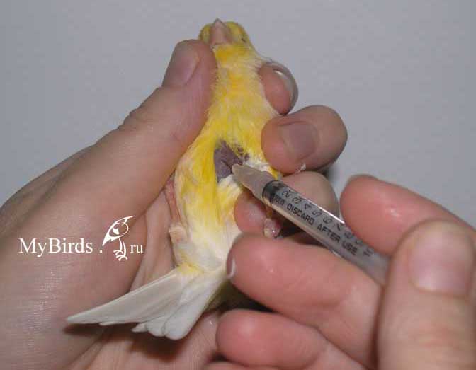 Рассмотрим на примере канарейки уколы мелким птицам и на примере жако уколы птицам средним и крупным.