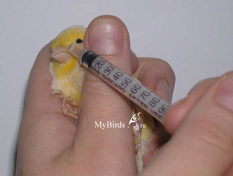Мелким птицам капельки лекарства из шприца или пипетки выдавливаются в уголок клюва, капелька сама «всосется» в клюв. Дозировки лекарства для такого способа выпаивания тоже рассчитываются ветеринарным врачом с учетом потерь – птичка может встряхнуть головой и часть препарата разлетится брызгами.