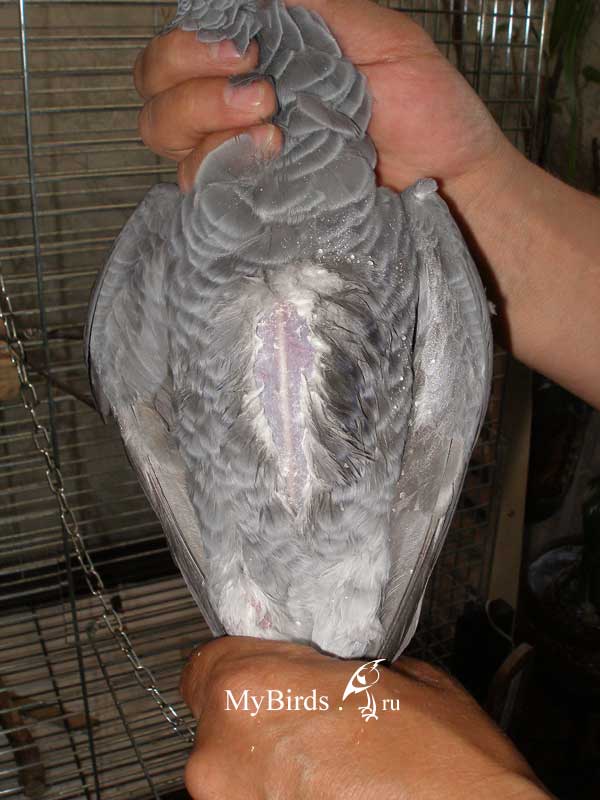 Зафиксировав голову птицы, надо внимательно осмотреть глаза, ноздри, клюв – не слоится ли чрезмерно, не нуждается ли в подрезке. Затем прощупать киль и грудные мышцы – насколько птица упитана или истощена. У худой птицы киль сильно выступает между грудными мышцами. Как правило, все недавно приобретенные птицы (в данном случае речь идет, в основном, о крупных и средних попугаях и хищных птицах, изъятых из дикой природы) либо худы, либо истощены. Клоаку тоже надо осмотреть, не испачканы ли перышки вокруг пометом, нет ли следов воспаления или клещевой инвазии. Далее, следует по одному расправить крылья и осмотреть