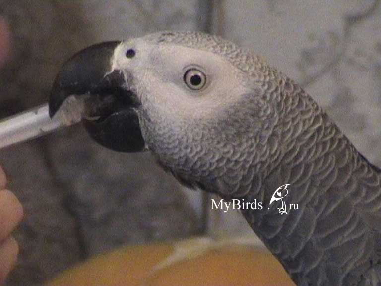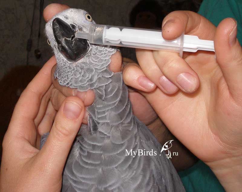Для ручной птицы возможно добровольное выпаивание лекарства из шприца без фиксации, однако это достаточно редкий случай и характерен он, как правило, для птиц, давно живущих у своих хозяев.