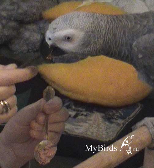 Другой метод – подмешать лекарственный препарат во влажные корма, если птица к ним приучена и охотно их ест. Но такой корм, в отличие от зернового, нельзя оставлять в кормушке надолго. Желательно влажный корм с лекарством (йогурт, кашу, овощное или фруктовое пюре) скормить птице сразу весь. Такие корма можно давать как в кормушку, так и с ложки, и из шприца без иглы, но два последних способа требуют предварительного обучения птицы такому виду кормления. Если птице прописаны одновременно несколько лекарственных средств, необходимо уточнить у врача, можно ли подмешивать эти лекарства в одну порцию корма, а если нельзя, то насколько по времени должны быть разнесены друг от друга приемы этих лекарств.