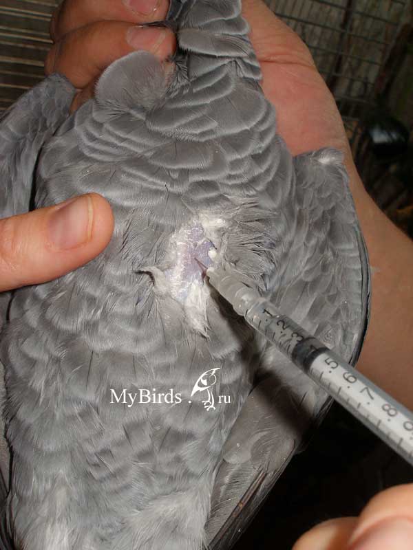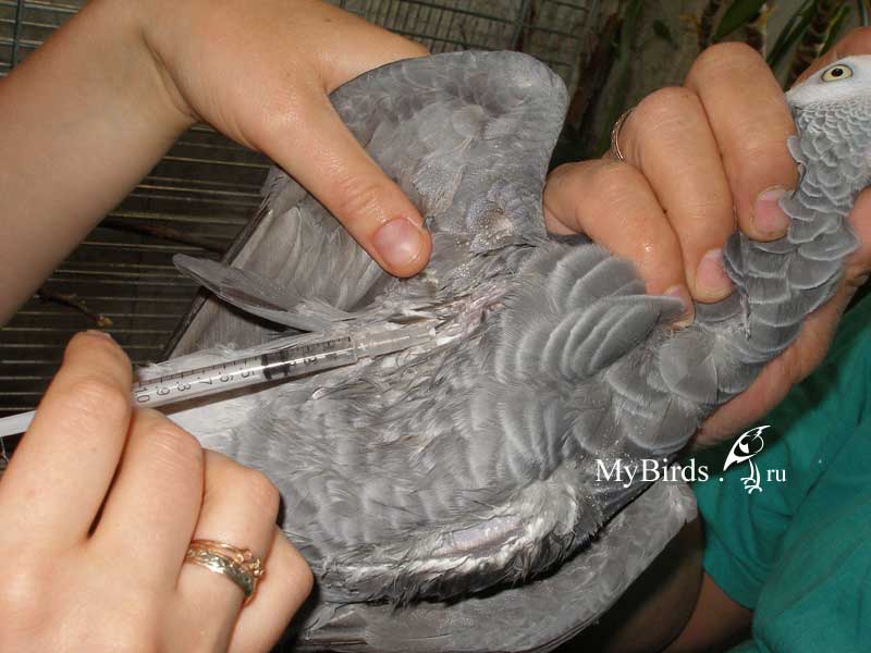 Точно так же надо раздуть перышки, смочить кожу спиртом и ввести иглу перпендикулярно поверхности кожи, только чуть глубже – на 3-4 мм. При этом ваш помощник должен крепко фиксировать птицу, что бы при прикосновении иглы птица, даже дернувшись (а крупная птица может проявить при этом недюжинную силу), не могла не только вырваться, но и пошевелиться, чтобы не нанести себе травмы иглой.