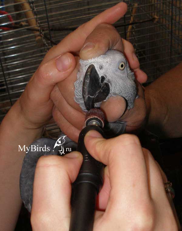 При некоторых патологиях у птиц чрезмерно растут клюв и когти и их приходится регулярно подтачивать. Если для ручной птицы подпиливание когтей и даже клюва можно превратить в игру, или, по-крайней мере, в рутинную манипуляцию, не прирученной птице придется делать эти процедуры с предварительной фиксацией.