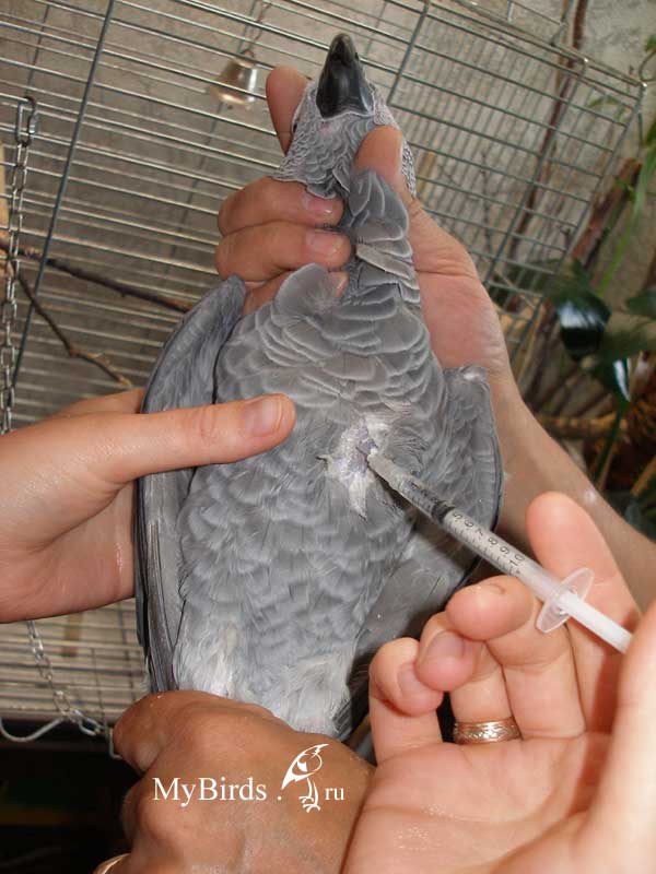 Крупной птице, хотя бы первые пару раз, уколы лучше делать вдвоем, поскольку, не имея опыта фиксировать птицу и одновременно делать ей укол одному очень сложно.