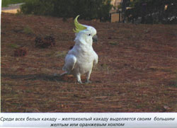 В качестве собеседника автор выбирает три вида: жако, белохохлый какаду и волнистый попугай. Если с жако и волнистым попугаем можно согласиться, то почему выбран какаду, а не амазон, например, непонятно. Более того, непонятно, почему выбран именно белохохлый какаду. Похоже, это непонятно и самому автору. Иначе, как оценить следующую фразу (стр.73):