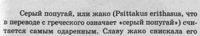 Степень владения предметной областью можно оценить и по корректным латинским названиям видов. В данной книге латынь встречается дважды: в разделе о жако и в разделе о какаду. За жако обидно - в каждом слове по ошибке (стр.39) :