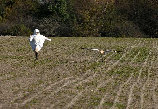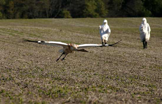 Пролетая над пастбищем. Ричард ведет одного журавля из Sauk County в Green County, Wisconsin.