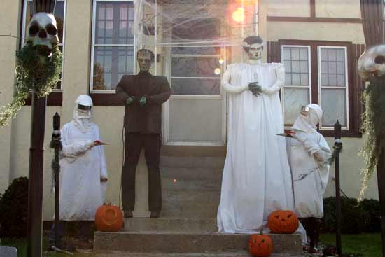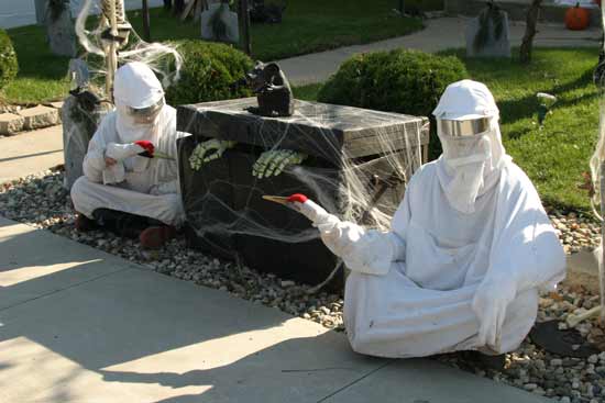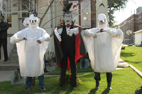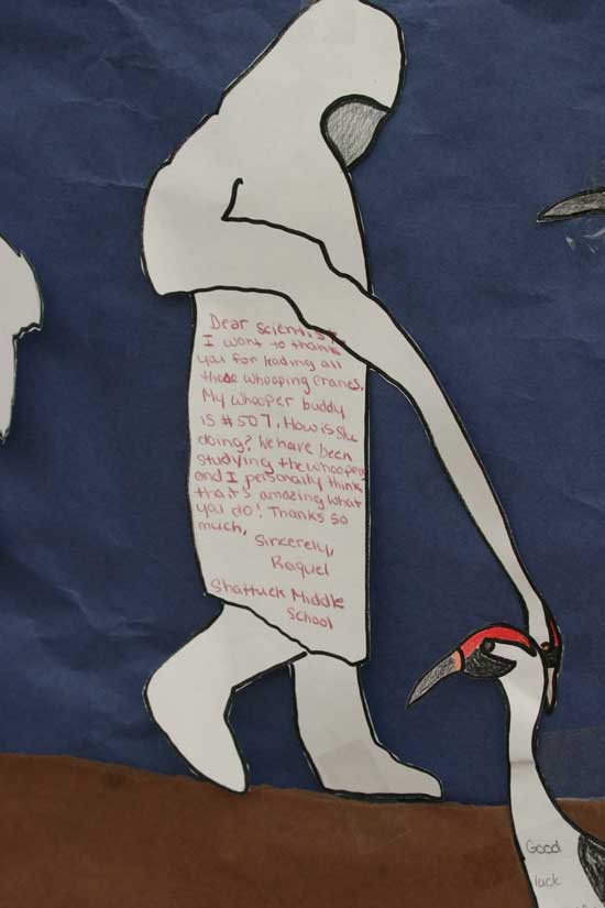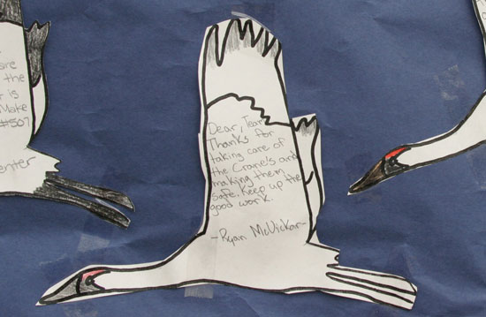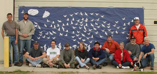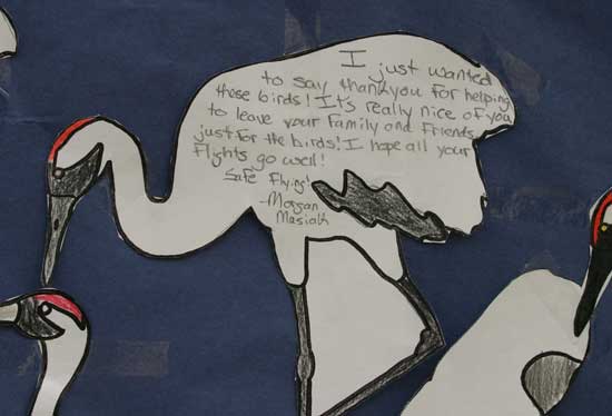 вся команда "Operation Migration" в сборе на фоне огромной поздравительной открытки сделанной в средней школе города Shattuck
