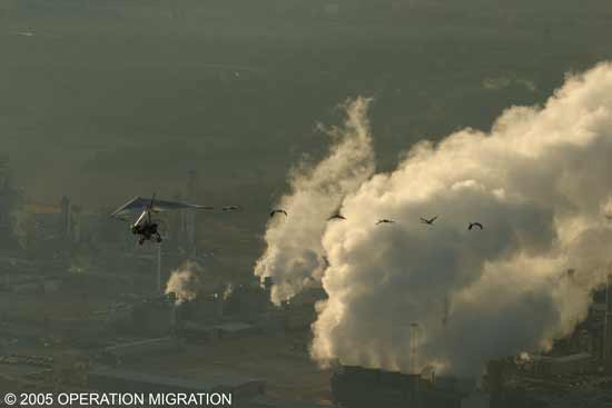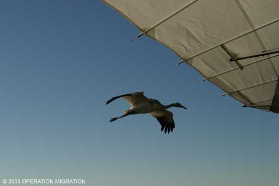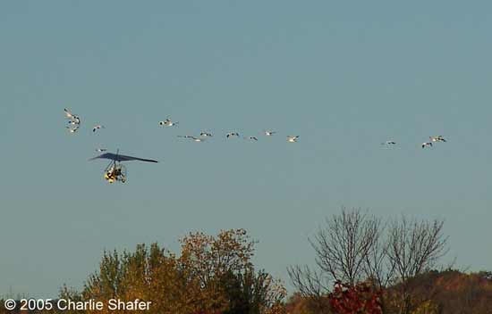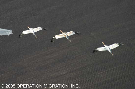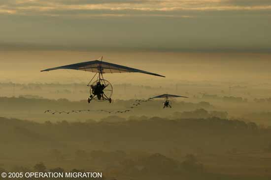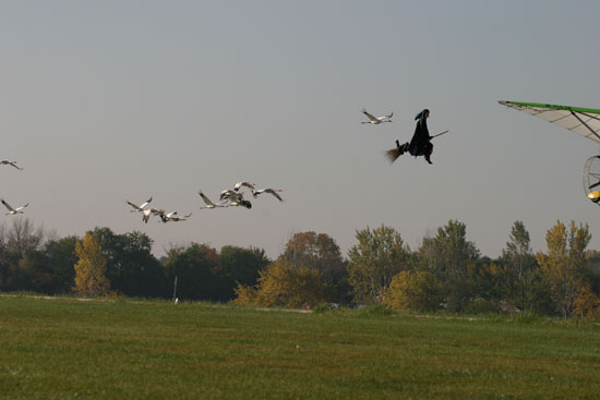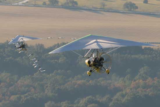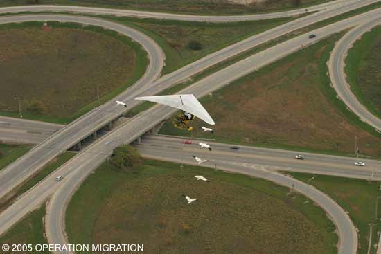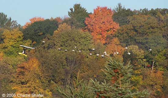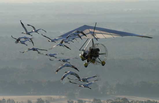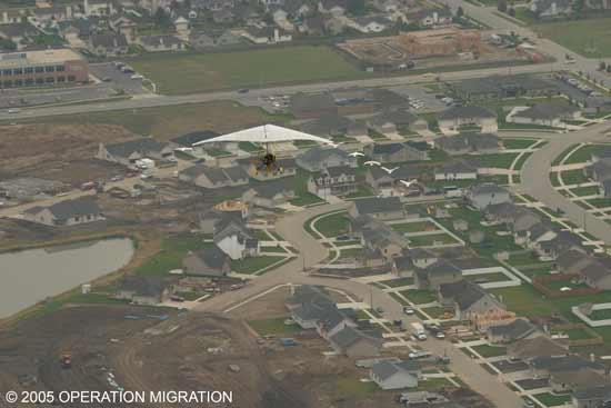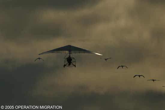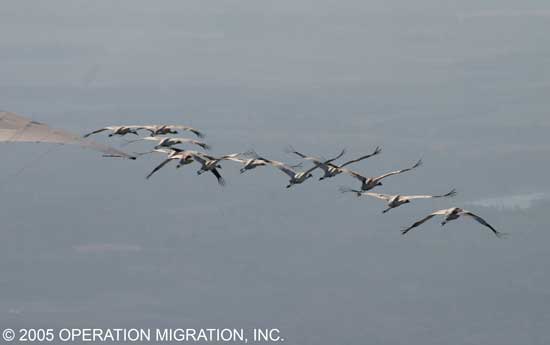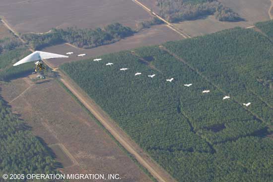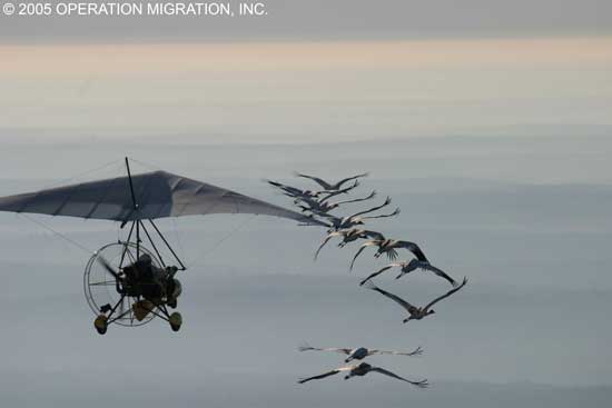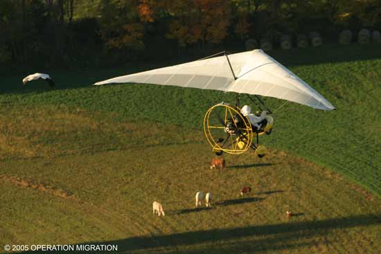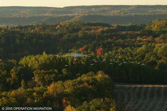 Брук Панипакер ведёт стаю из Sauk County в Green County, Wisconsin. Этот снимок был сделан за несколько минут перед тем как 516 птенец запутался в проволочном каркасе дельтаплана Брука.