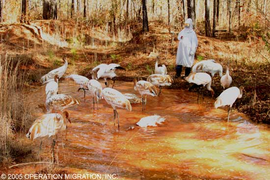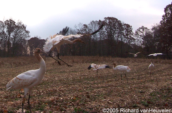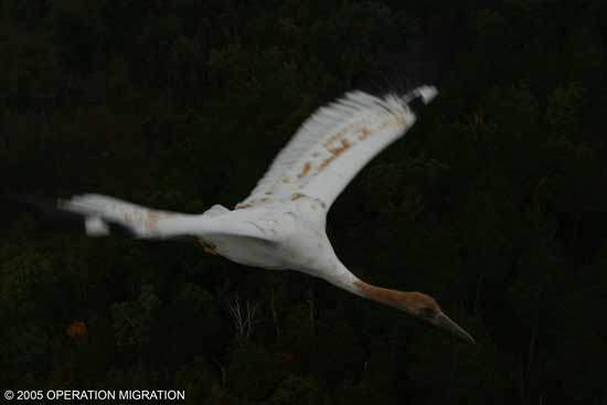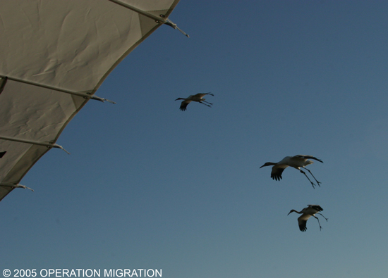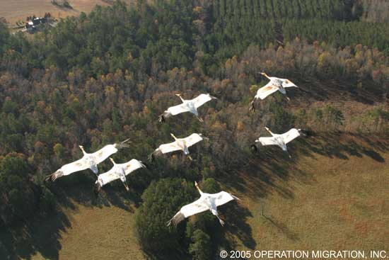 Брук, ведёт стаю в начале полёта, за его крыльями 19 журавлей, Ричард в ожидающей позиции, он всегда готов подхватить птиц, оторвавшихся от основной группы.