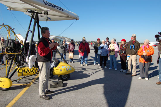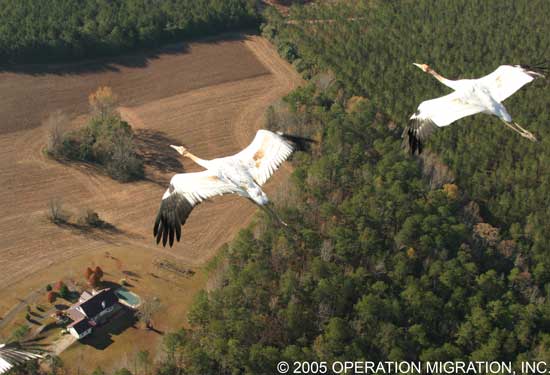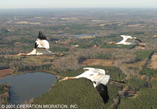 Дон и Паула Лоундсбери летают над летящей стаей журавлёй на их Сесне, это помогает отслеживать птиц отбившихся от основной стаи.
