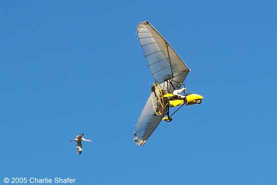 Птица скользит в воздушном потоке создаваемом крылом дельтаплана Джо Даффа.