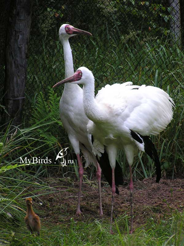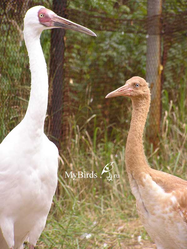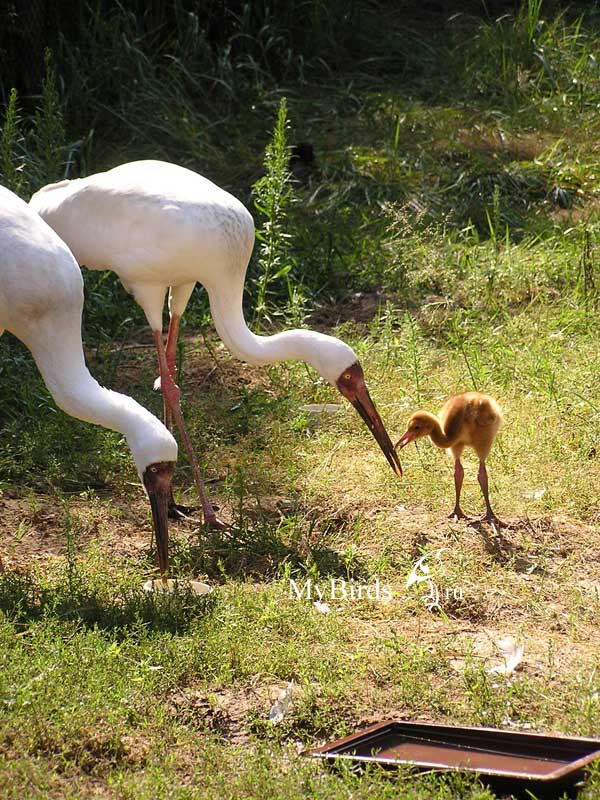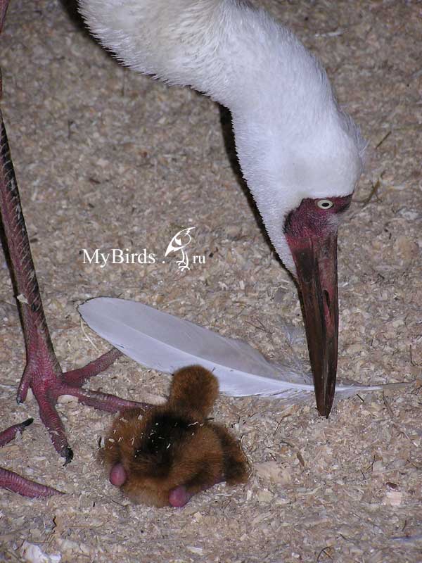 А про непосредственное участие Колымы в размножении следует сказать отдельно. Четыре года размножалась пара. Мы, уверенные, что наш скромный подранок не может оплодотворить самку, все четыре года проводили осеменение. В 1999 г. Билипу отложила первое яйцо необычно рано, еще до начала искусственного осеменения. Будучи уверенными в том, что яйцо не оплодотворено, мы все-таки поместили его в инкубатор. И вот сюрприз - через 29 дней, как и положено у стерхов, вылупился Сюрприз. Вот так Колыма! Как ему с одним полноценным крылом удалось спариться с самкой, мы не знаем до сих пор. Не показывают.